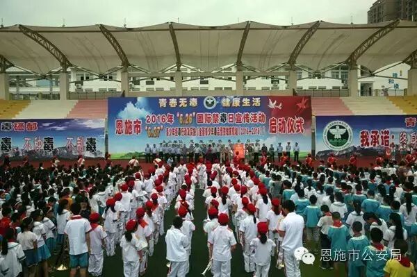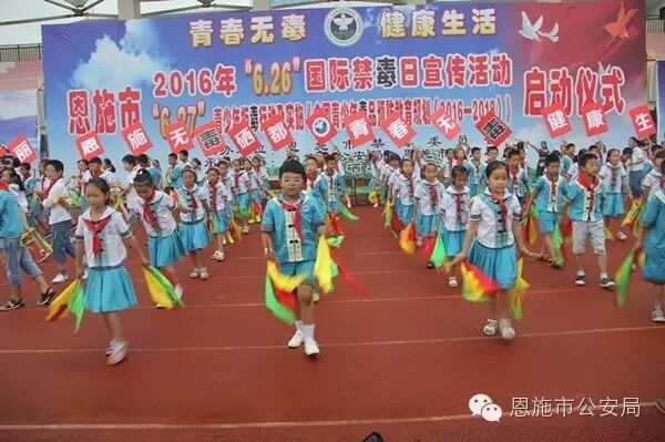 6月24日,恩施市在硒都民族实验小学举行2016“青春无毒,健康生活”系列宣传活动启动仪式。恩施市市委常委、政法委书记黄波宣布启动仪式开始,恩施州公安局副局长、恩施市副市长、公安局长范荣致辞。恩施市禁毒成员单位负责人和硒都民族实验小学全体师生及志愿者代表参加启动仪式。