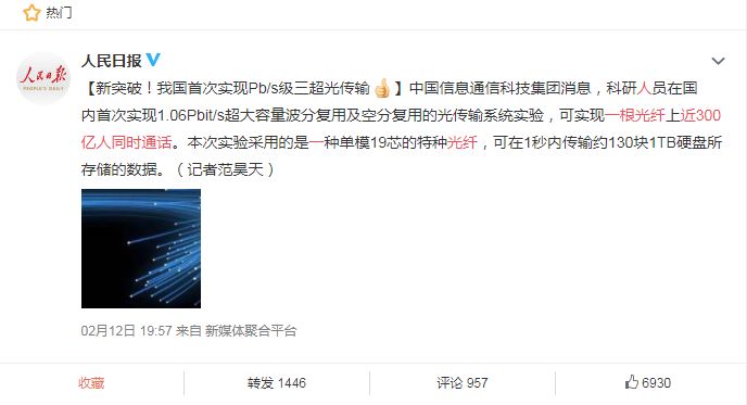 昨日消息,据相关媒体从中国信息通信科技集团获悉,中国光通信技术再次取得突破性进展,首次实现1.06Pbit/s超大容量波分复用及空分复用的光传输系统实验。可以实现一根光纤上近300亿人同时通话,标志着我国在“超大容量、超长距离、超高速率”光通信系统研究领域迈向了新的台阶。